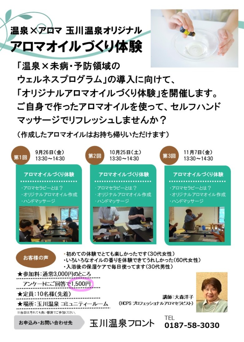 「玉川温泉オリジナルアロマオイルづくり体験」を開催します。